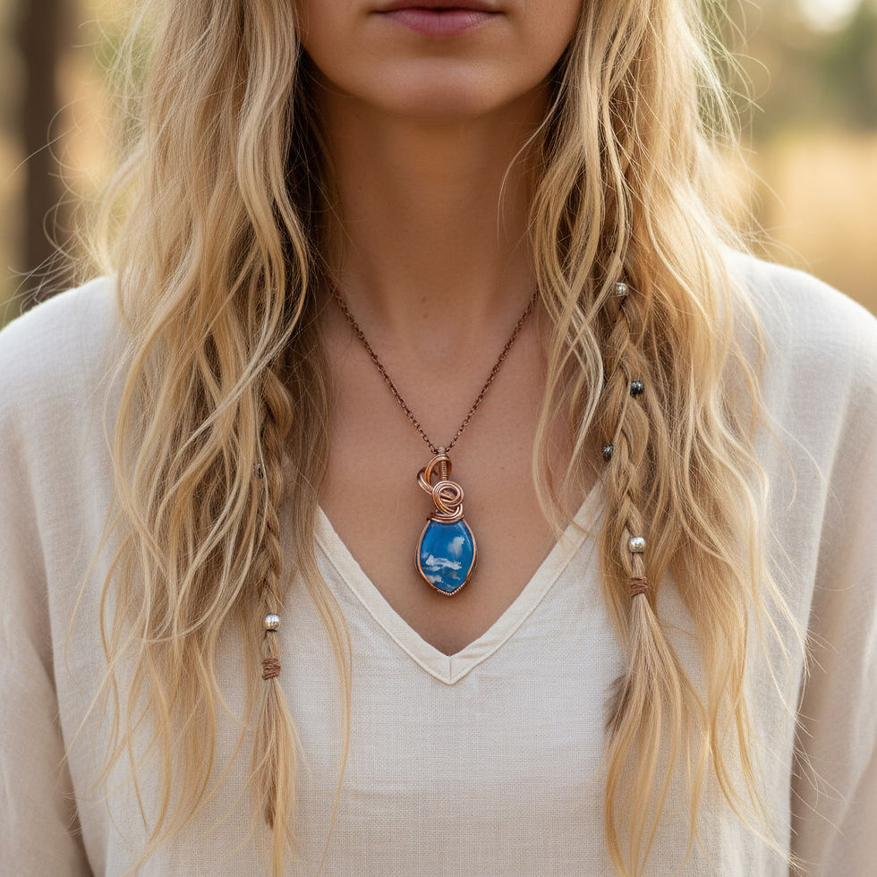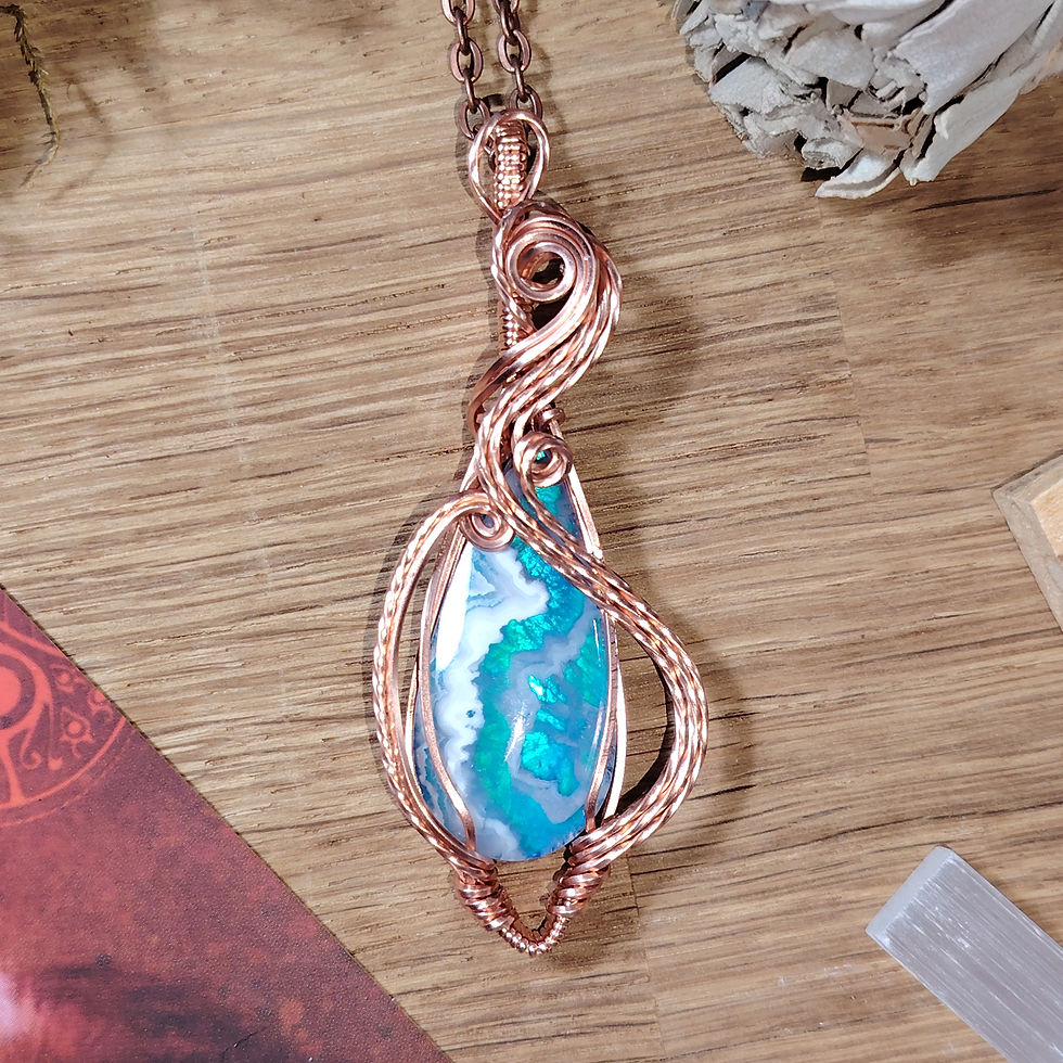 Every pendant is wire-wrapped by hand using ethically sourced gemstones, finished in silver or copper.
