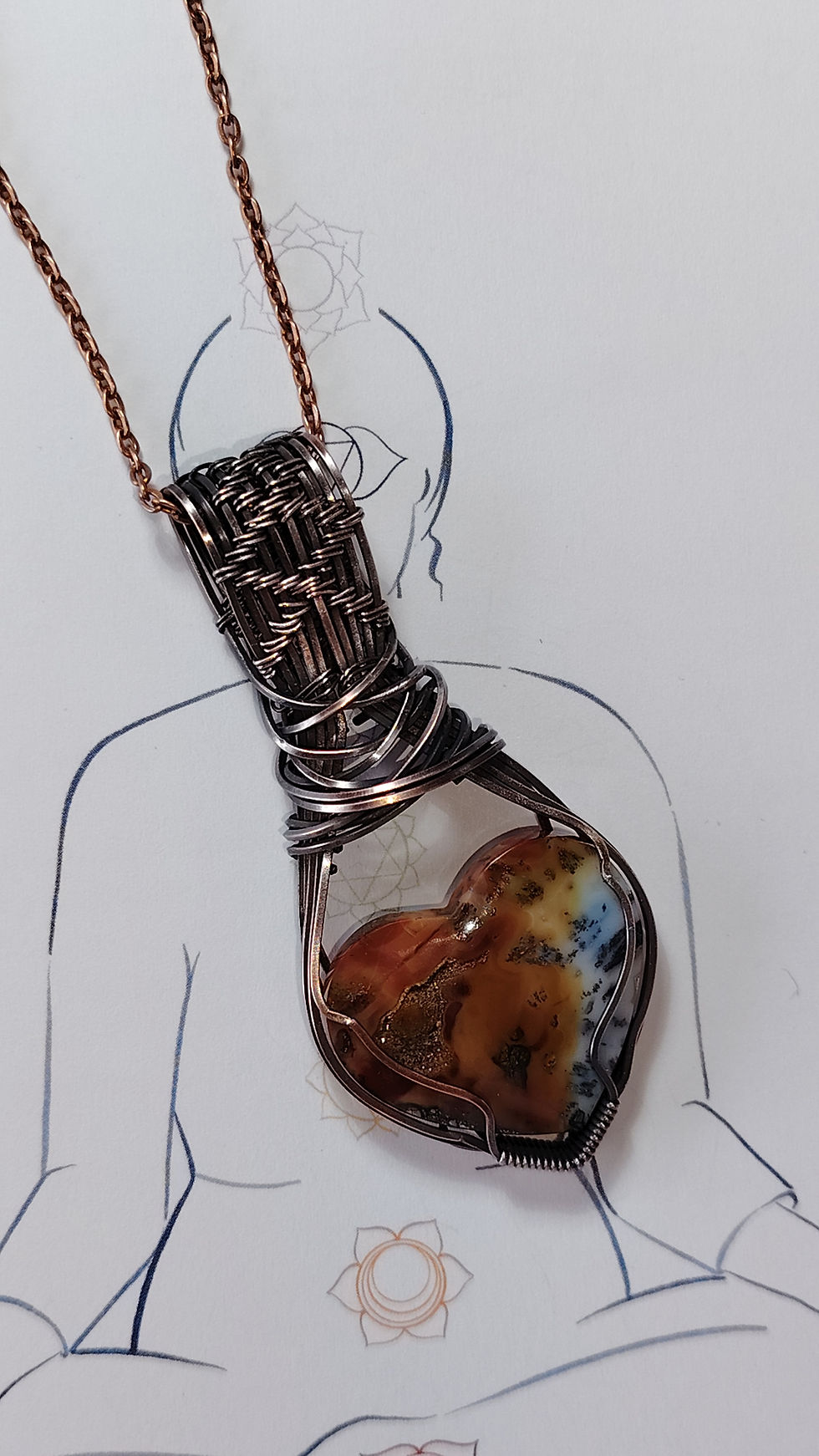 This one-of-a-kind pendant features Plume Agate, hand-carved into a soft heart and wrapped in silver-plated copper. The stone’s dreamy, cloud-like patterns evoke a secret garden in bloom, offering comfort and calm whenever you need it most. Plume Agate is known for nurturing new beginnings, encouraging self-love, and inviting peaceful transformation.